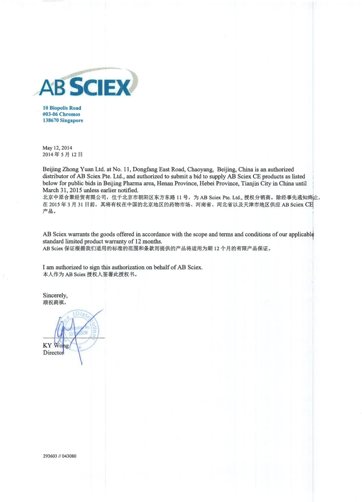 2014年4月1日,北京中原公司正式成为AB Sciex Pte. Ltd., 授权分销商。中原公司有权在中国的北京地区的药物市场、河南省、河北省以及天津市地区供应AB Sciex CE产品。