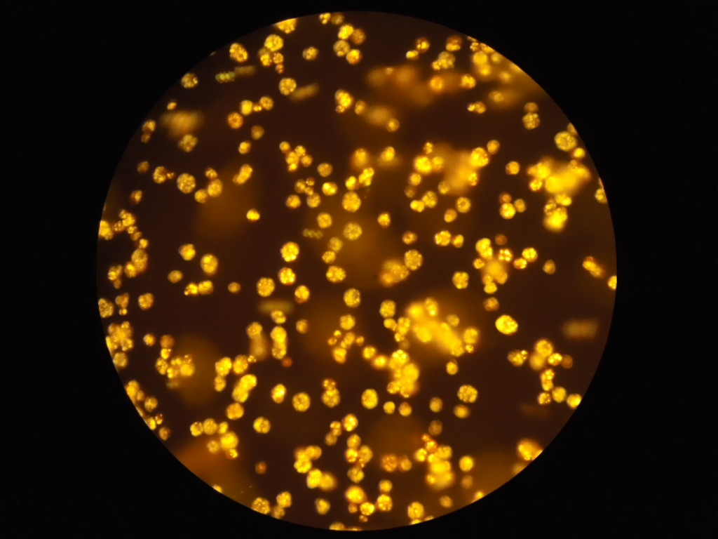 “荧光显微镜下观察到的尼罗红染色后的寇氏隐甲藻,像满天繁星一样耀眼!”
