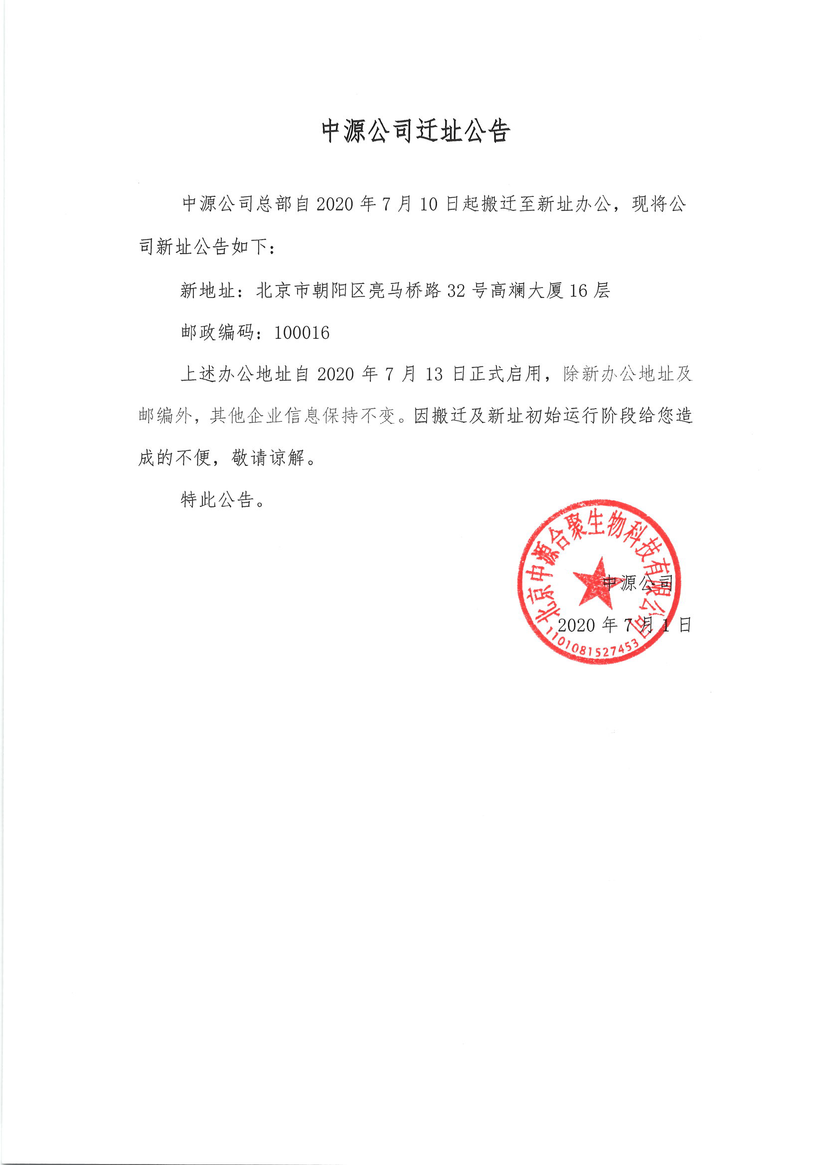 重要 | 中源公司总部迁址公告
