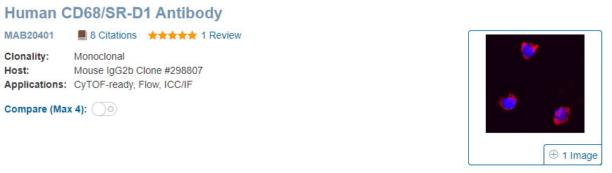 例如,巨噬细胞标志物 CD68(货号 MAB20401)抗体,应用栏中仅标出了 ICC/IF,虽然不能确定一种抗体在每一种组织中都有同样的表现,但我们可以证明其对固定抗原的识别,所以也可应用于 IHC 实验。