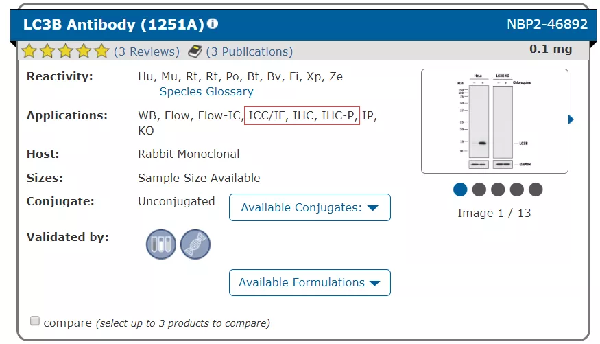 以自噬标志物 LC3B(NBP2-46892)为例,应用栏中标出了 ICC/IF,IHC,IHC-P,说明此产品已验证适用于 ICC/IF 和 IHC-P,未验证 IHC-Fr 实验。