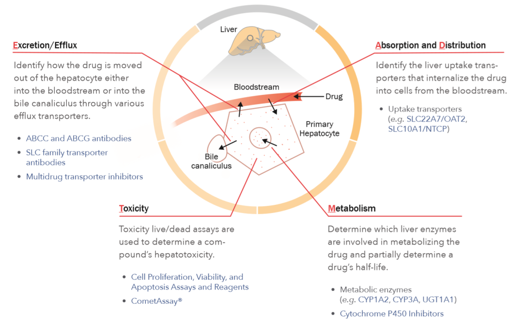 图 1  在原代肝细胞中进行药物/化合物的吸收、分配、代谢、排除以及毒性(ADME/TOX)的研究,对于评估药物安全及药代动力学至关重要。