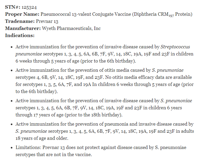 2000年,在没有合适的青少年疫苗的近20年后,美国惠氏(后被辉瑞收购)开发出一种7价肺炎结合疫苗(PCV7,Prevnar;惠氏),并在美国被授权用于婴幼儿。这种疫苗是通过蛋白载体与血清型4,6B,9V,14,18C,19F和23F的纯化多糖共价偶联产生的。