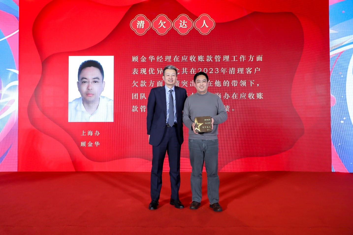 大会颁发的第三个奖项是清欠达人奖,由经销体系副总裁史忠为获奖者顾金华颁奖。