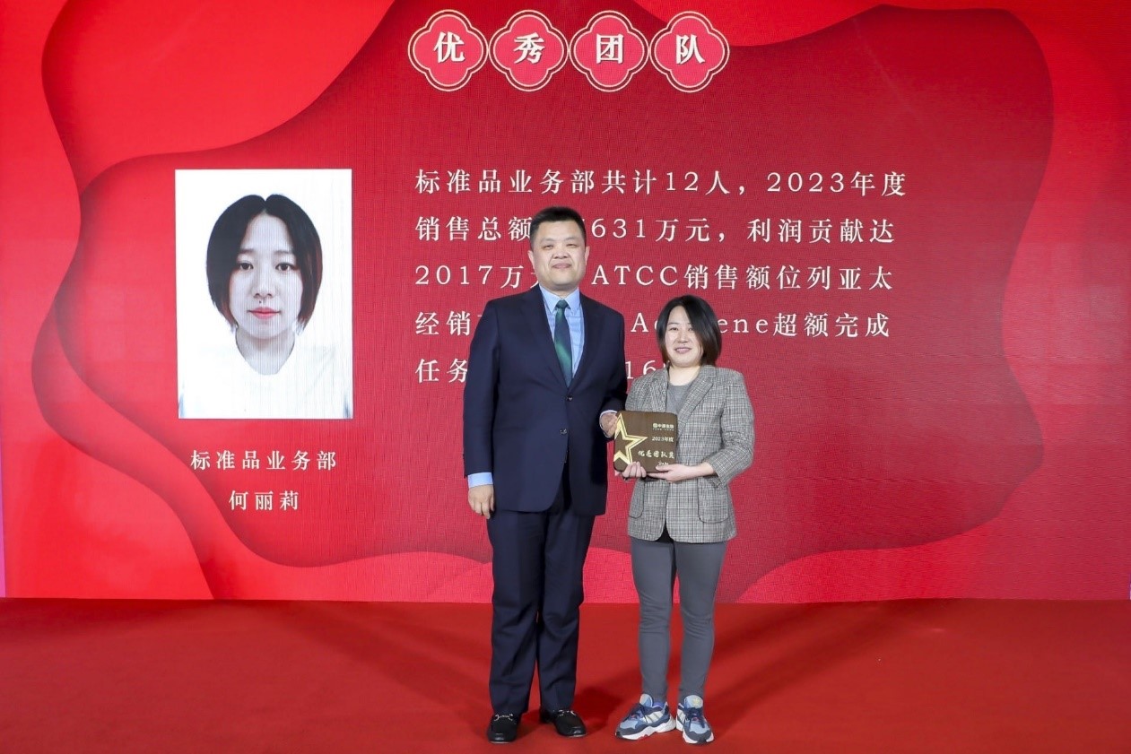 大会颁发的第四个奖项是优秀团队奖,由职能体系副总裁李志刚为获奖团队标准品业务部颁奖,部门副经理何莉丽代表部门上台领奖。