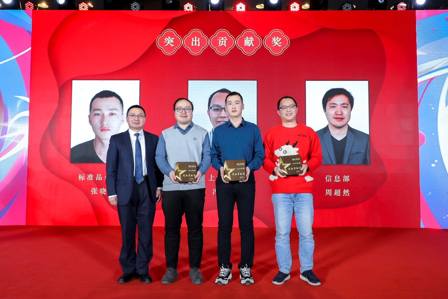 大会颁发的第五个奖项是突出贡献奖,对平台体系、经销体系、职能体系在2023年度做出卓越贡献的同事进行表彰,本奖项由经销体系副总裁李景华为获奖者张晓森、冯明、周超然颁奖。