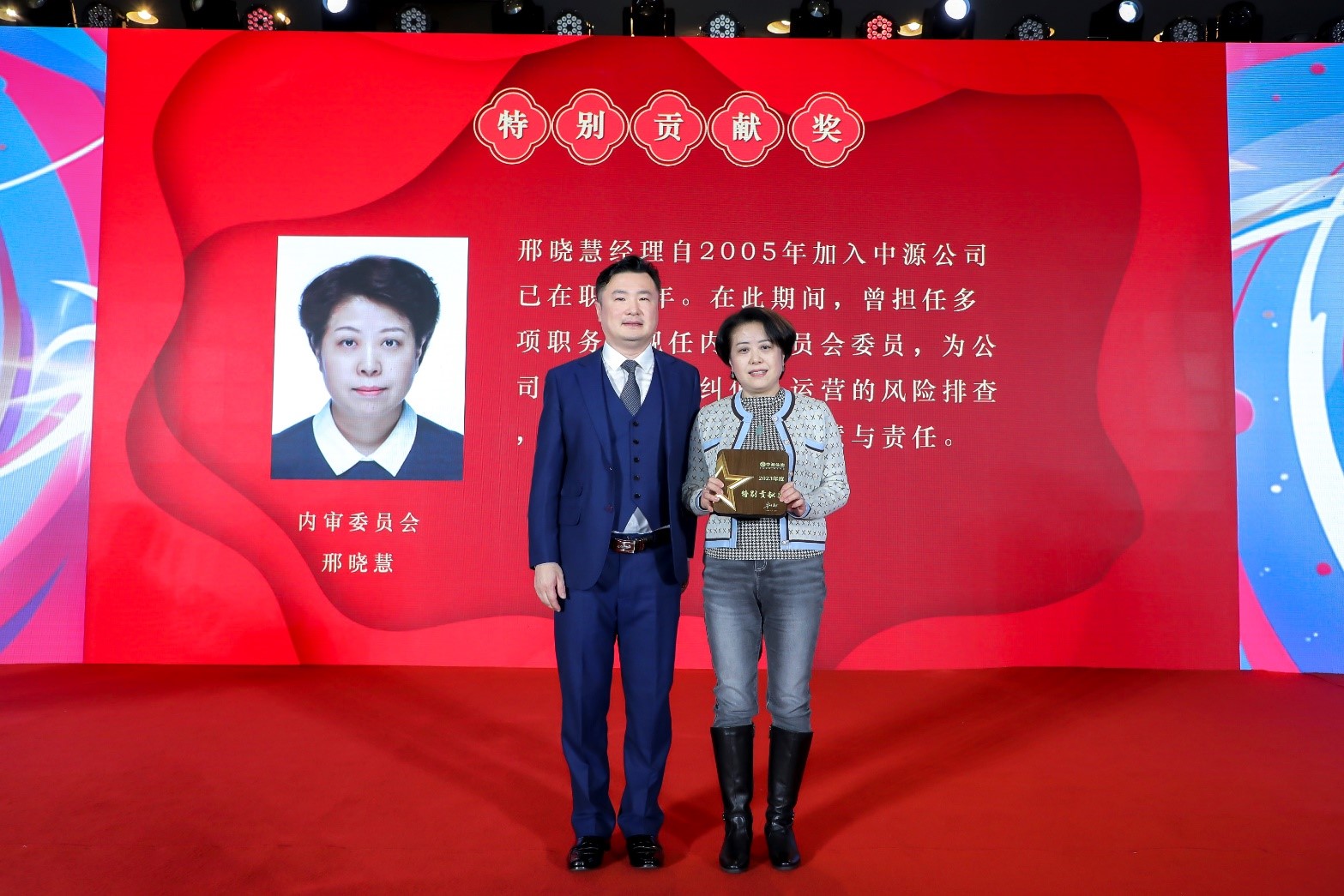 大会颁发的第六个奖项是特别贡献奖,由朱晓勇总裁为获奖者邢晓慧颁奖。邢晓慧经理在中源公司兢兢业业19个年头,曾担任多项重要职务,已于1月31日正式退休,为表公司感谢特向邢晓慧经理颁发特别贡献奖。